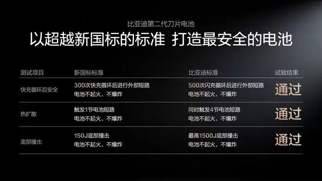 在公开演示中,电池包在经历了 500 次闪充循环后,一边进行大功率充电一边接受钢针贯穿测试,全程无烟无火;随后的 4 节电芯同时短路无热扩散测试,以及标准高达新国标 10 倍的底盘刮底撞击实验,均安然通过。