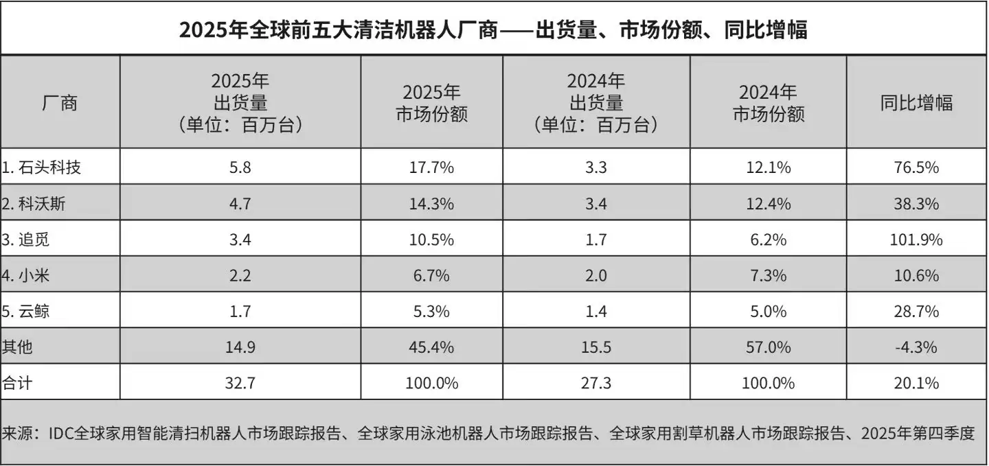 石头科技出货量580万台,市场份额17.7%,同比增长76.5%;