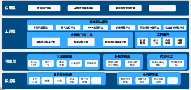 3.工具层:垂类算法模型(车型识别、nox 定性)直接对应 “高排放车辆精准识别”的业务目标;批量排查、统计分析等工具组件,则是一线监管人员 “筛选违规车辆、生成治理报表”的常用功能载体,实现了技术能力向业务工具的转化。