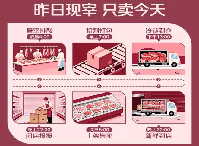 所谓「24小时肉」,就是从产地到门店,全程不超过24小时,到店只卖一天,不囤货、不隔夜。