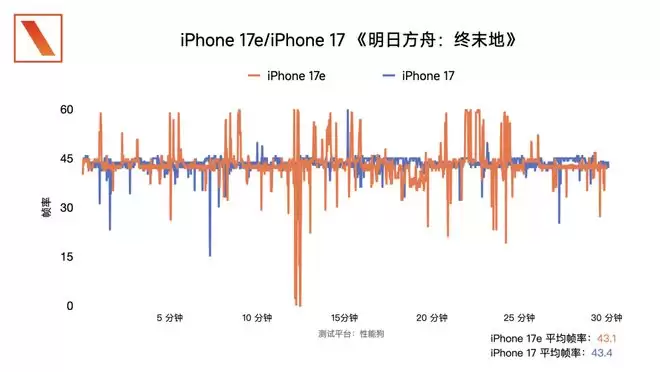 但从实际的游戏表现来看,iPhone 17 30 分钟《终末地》平均帧率 43.4,和 iPhone 17 的 43.1 可以说相差无几,后者会相对稳一点。