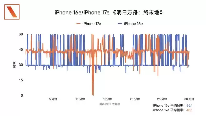 《明日方舟:终末地》20 分钟,iPhone 17e 的平均帧率 43.1,iPhone 16e 的平均帧率 36.1,从帧率曲线看,iPhone 17e 也要更稳定,而 iPhone 16e 会在 30 帧和 60 帧之间反复横跳。总体来说游玩的体验相近,不过 iPhone 16e 的机身反而会没那么烫手。