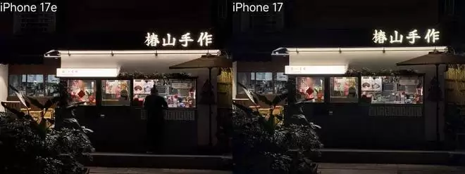 至于影像能力,少一个超广角的焦段不必提,iPhone 17e 的主摄传感器尺寸还比 iPhone 17 要更小,因而解析力略逊一筹,暗光场景差距会明显一点。