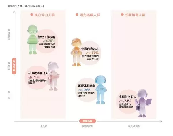 然而,比硬件销量回暖更深层的变革,是PC正在从“孤岛”走向“连接”。报告揭示了一个关键趋势:用户不再满足于“PC处理工作、手机消费内容”的割裂模式,而是期待任务与体验的无缝流转。数据显示,95%的智效工作极客群体近乎每日都会产生跨端操作行为,WLBe效率主理人这一行为占比超过85%,创意内容达人、沉浸体验玩咖、多屏任务职人等群体也对跨端操作提出更多需求。PC不再是移动互联网的备选终端,而是正在与移动生态深度融合,催生出一个全新的“跨端生态”。