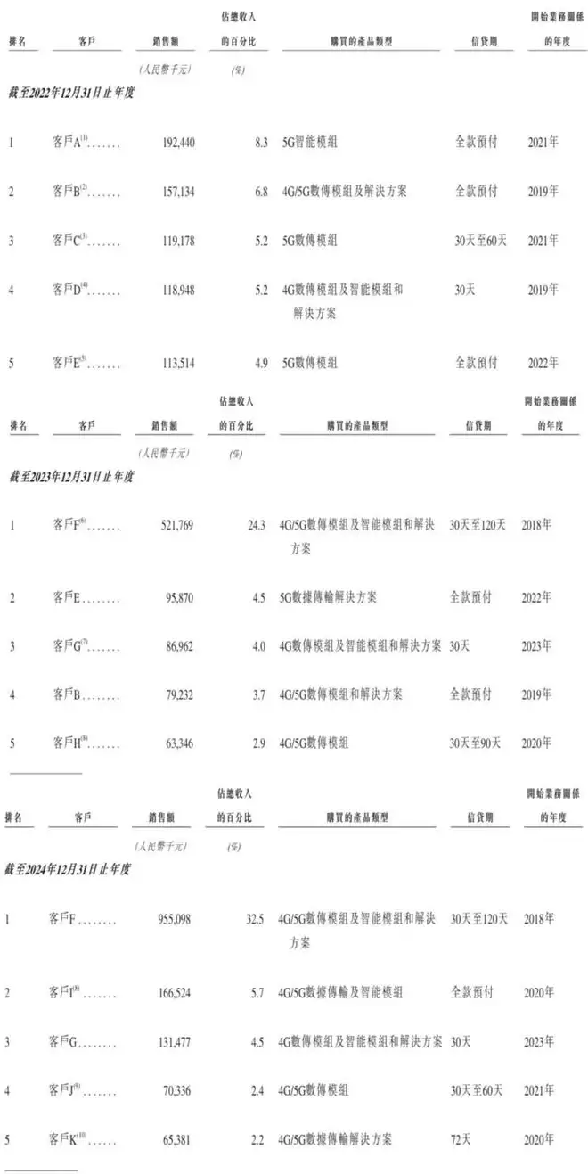 2024年-2024年,美格智能来自前五大客户的收入分别为7.0亿元、8.5亿元及13.9亿元,分别占同期总收入的30.4%、39.5%及47.2%。