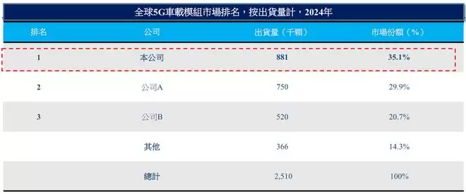 根据弗若斯特沙利文的资料,美格智能是全球首家推出智能模组产品的公司,并在新能源汽车中实现了5G智能模组的大规模部署。在全球5G车载模组市场,按出货量计算美格智能的市场排名为第1。