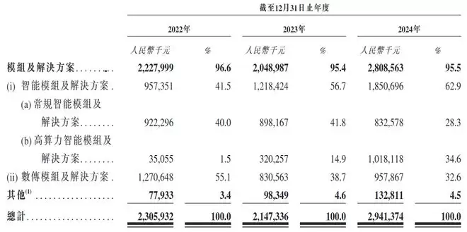 按模组和解决方案划分,2024年-2024年,美格智能的智能模组及解决方案分别贡献了该公司当年度营收的41.5%、56.7%和62.9%,数传模组及解决方案分别贡献了该公司当年度营收的55.1%、38.7%和32.6%。