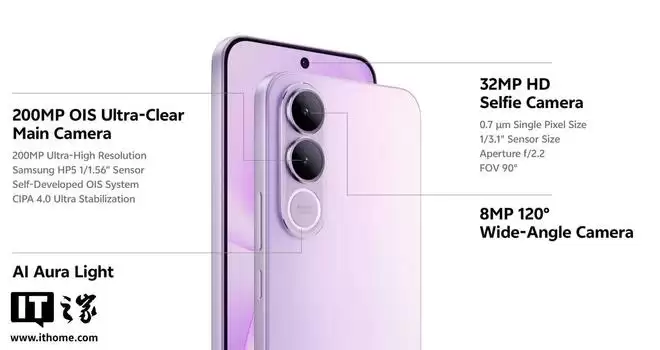 整机厚度为7.59毫米,重量约200克。正面配备一块6.78英寸的2800x1260分辨率120Hz AMOLED屏幕,支持HDR显示,峰值亮度达1900尼特。前置摄像头为3200万像素,后置则采用双摄方案:包括2亿像素主摄和800万像素超广角镜头。