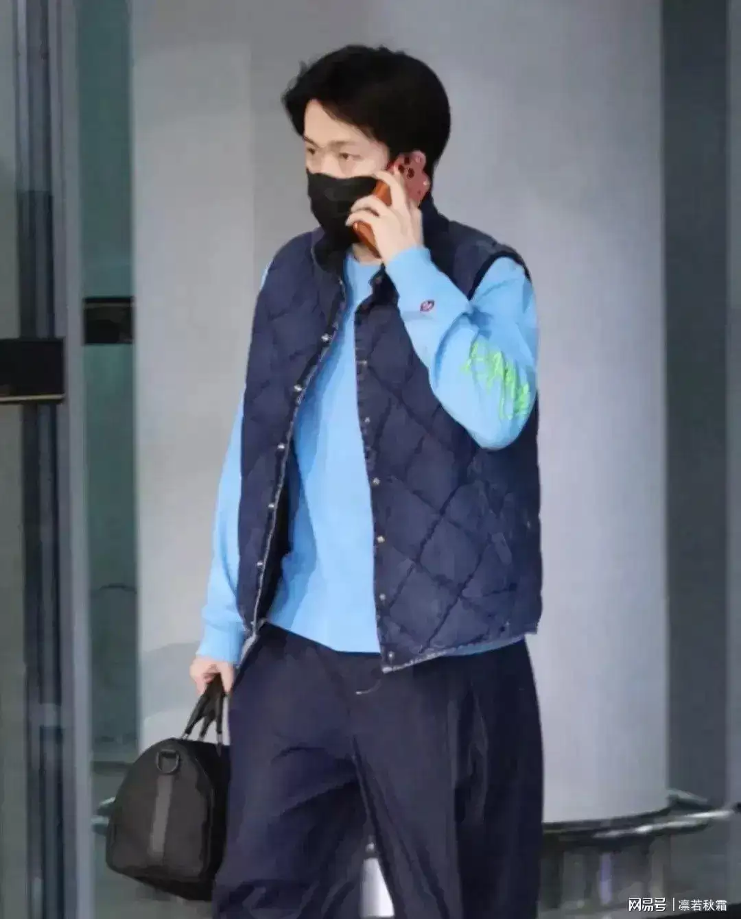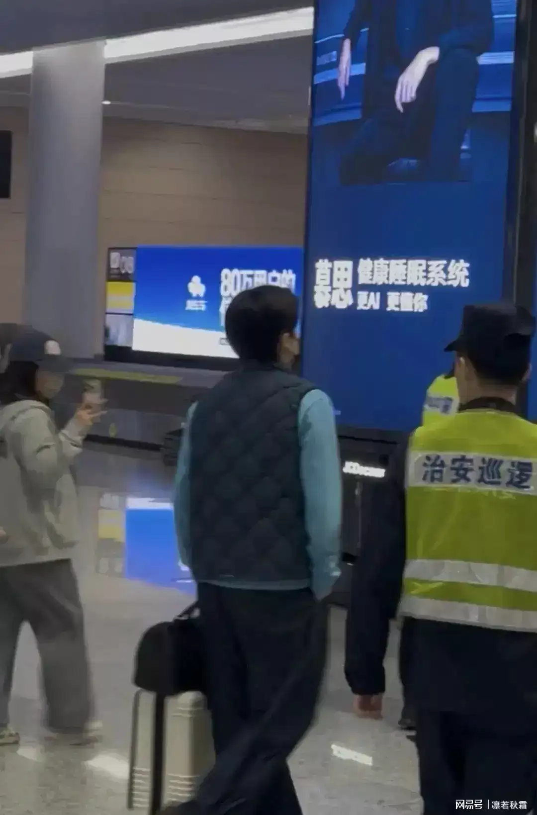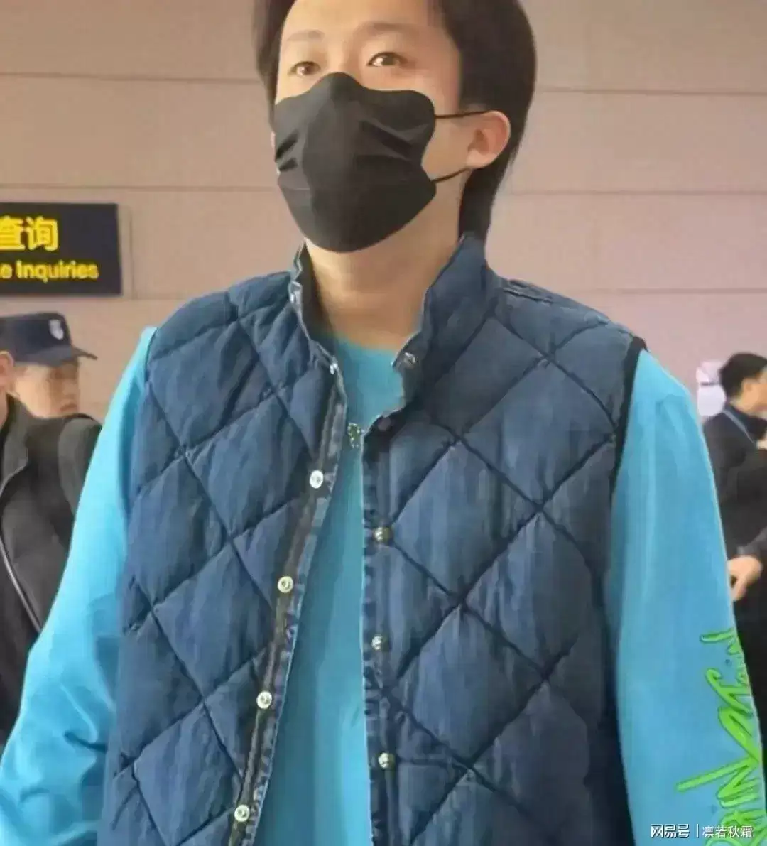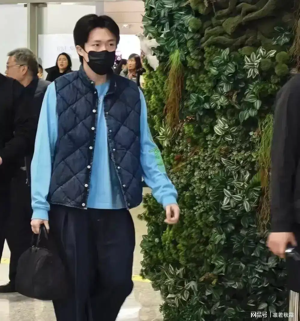 他内穿天蓝色卫衣,外搭一件深色马甲,简单的叠穿就很有范儿,配色干净、版型利落,满满的初秋男友风。早起赶航班可能没太睡醒,偶尔揉揉眼睛,反而显得更真实可爱。素颜状态依旧能打,身材挺拔、步履沉稳,没有多余的架子,既低调又很有气场。