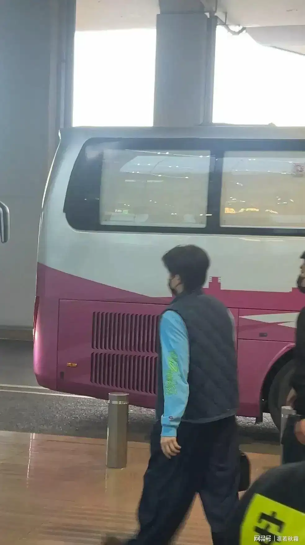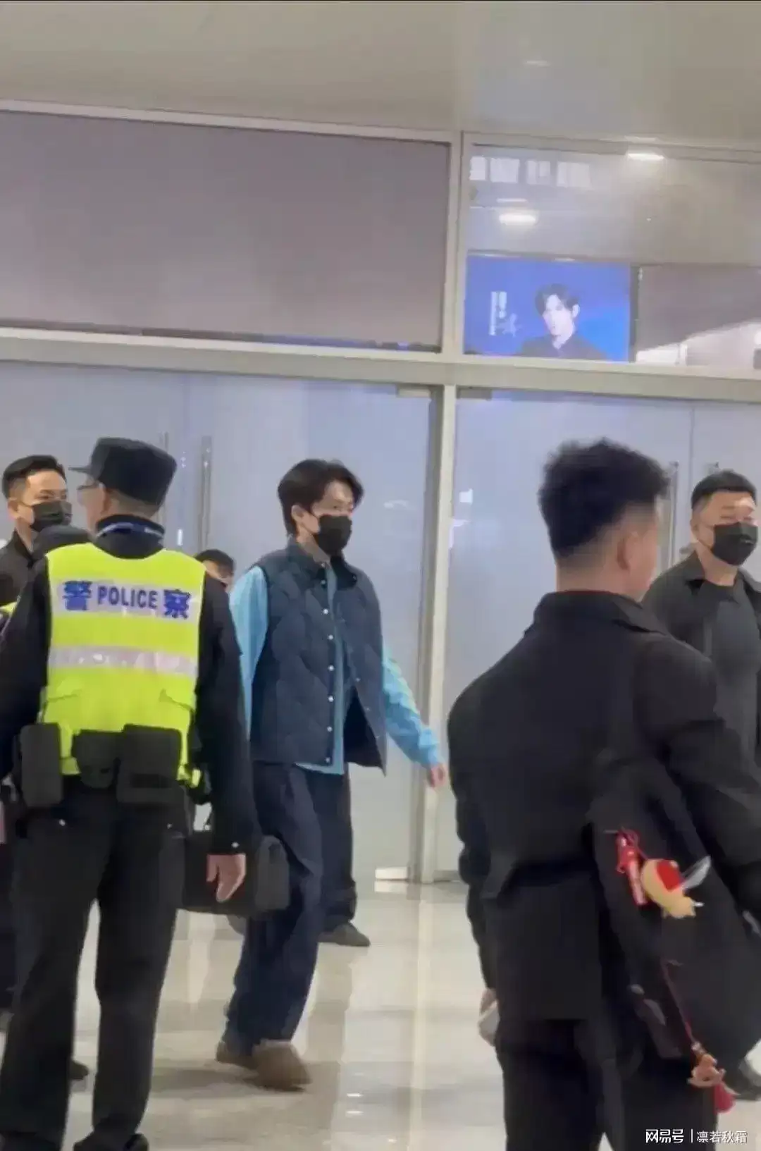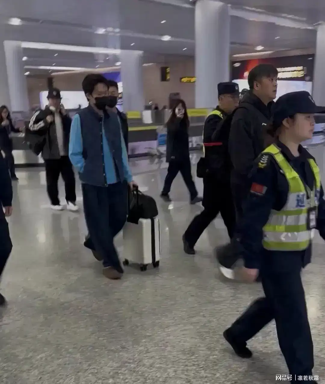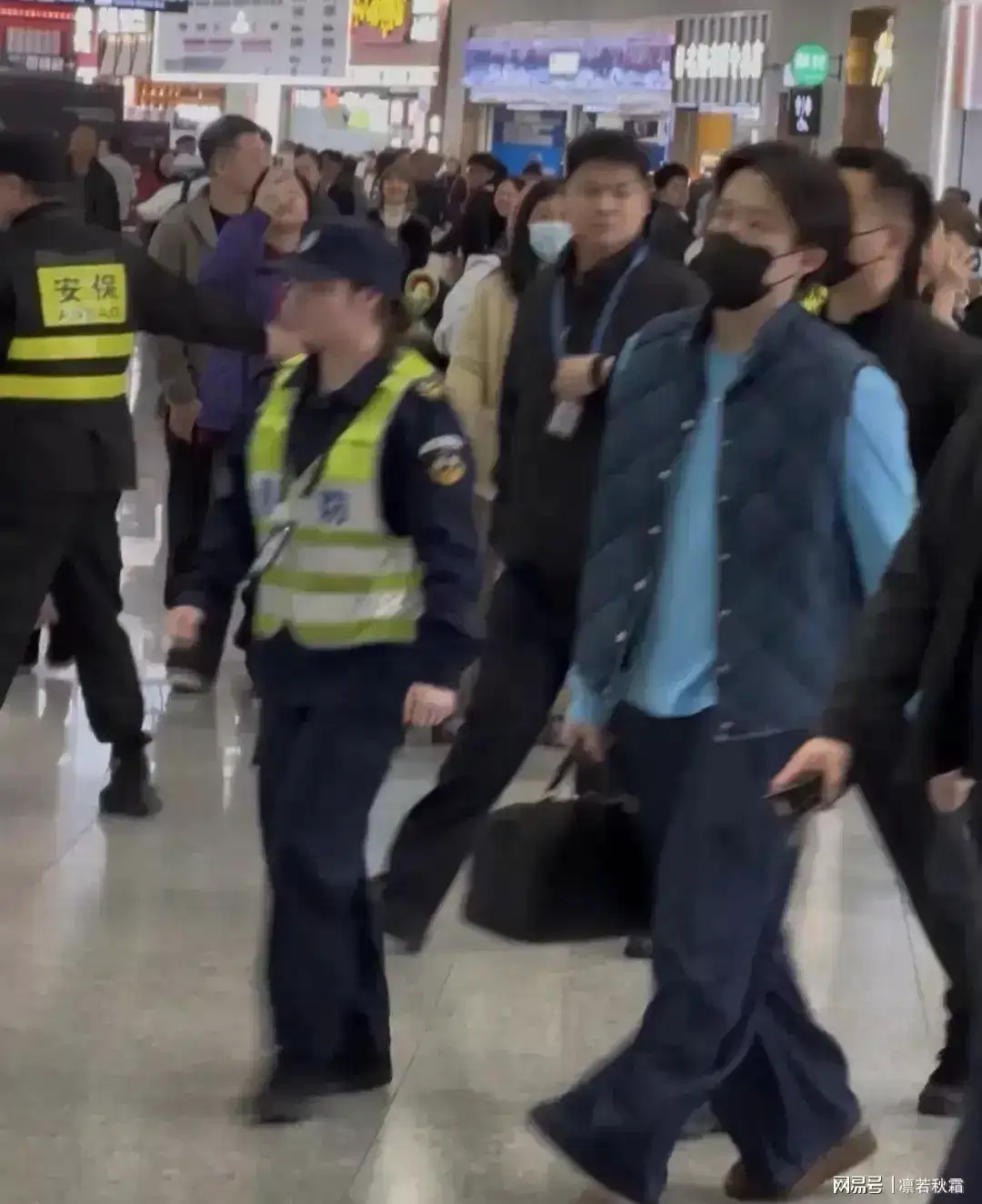 他内穿天蓝色卫衣,外搭一件深色马甲,简单的叠穿就很有范儿,配色干净、版型利落,满满的初秋男友风。早起赶航班可能没太睡醒,偶尔揉揉眼睛,反而显得更真实可爱。素颜状态依旧能打,身材挺拔、步履沉稳,没有多余的架子,既低调又很有气场。