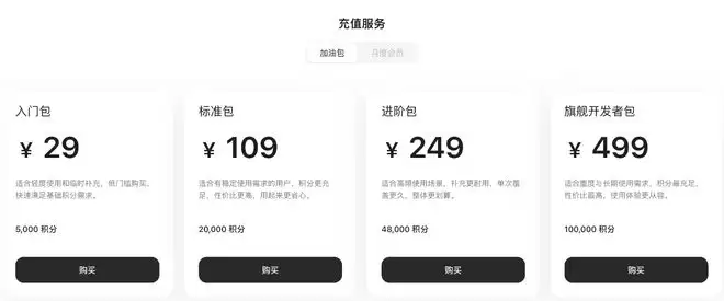 当赠送的2500积分消耗完之后,用户可以自行购买积分套餐。入门包29元,为5000积分;标准包109元,为20000积分;进阶包为249元,为48000积分;旗舰开发包为499元,为100000积分。