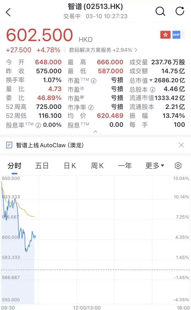 智谱今日开盘大涨12.6%,报648港元(约合569.97元人民币)/股;开盘后股价有所回弹,截至10点27分,报602.5港元(约合530元人民币)/股,上涨4.78%,总市值2686.2亿港元(约合2362.97亿元人民币)。