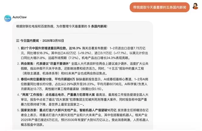 智东西第一时间体验了AutoClaw,发现在像下载App一样下载完AutoClaw之后,1分钟简单配置后,我就可以通过对话方式让AutoClaw为我干活。如下图所示,我让其“帮我提取今天最重要的五条国内新闻”,其在一分钟之内给出了这些新闻,消耗了39个免费积分。