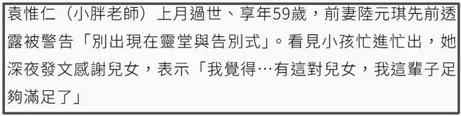 此前陆元琪曾发文吐槽袁惟仁家人不希望她出席告别式,觉得心寒,而设灵堂追思,陆元琪也未曾露面,网友都以为她不会再来。没想到她还是在告别式露面,见袁惟仁“最后一面”,不让孩子们为难也全了体面。