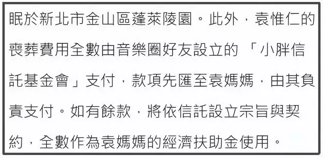 据悉,这次袁惟仁丧葬的费用,全都由音乐圈好友为袁惟仁设立的“小胖信托基金会”支付,款项直接汇给袁惟仁母亲,如果有剩余,则全数作为袁惟仁母亲的经济扶助金,也算是袁惟仁这群朋友们给他妈妈养老了。