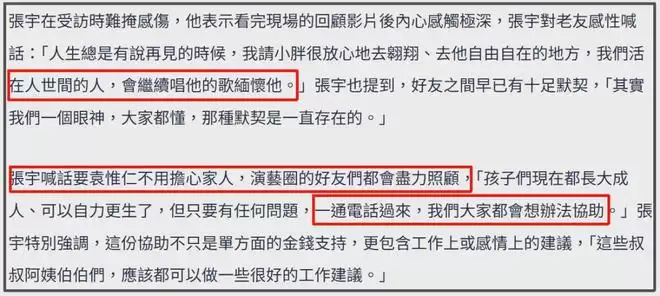 张宇接受采访时也表示,大家会继续唱袁惟仁的歌来缅怀他。也不用担心家人,演艺圈的朋友们会尽力照顾,尤其提到袁惟仁的两个孩子,直言“一通电话过来,大家都会想办法协助”,无论是金钱还是工作或是情感建议,看得出来,张宇真的把好友的孩子当成自己家人照顾。