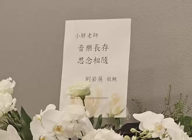 刘若英也送上花篮,并配文“小胖老师,音乐长存,思念相随”。