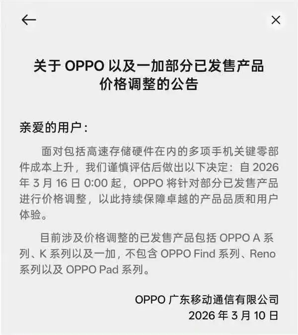 3月10日,手机行业传出重要动向。OPPO与一加双双发布调价公告,宣布将从3月16日起,对旗下已上市的OPPO A系列、K系列以及一加相关产品进行价格调整。