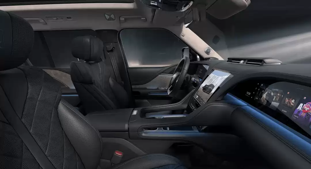 科技配置上,12.8英寸星河曲面屏依然是视觉中心。这块OLED屏幕拥有37度倾斜角,既能有效避免反光,又方便驾驶者进行操作。23.6英寸的全液晶仪表、副驾娱乐屏以及后排两块独立娱乐屏共同组成五屏联动系统,支持视频内容无缝流转,让前后排乘客都能享受到顶级的视听体验。