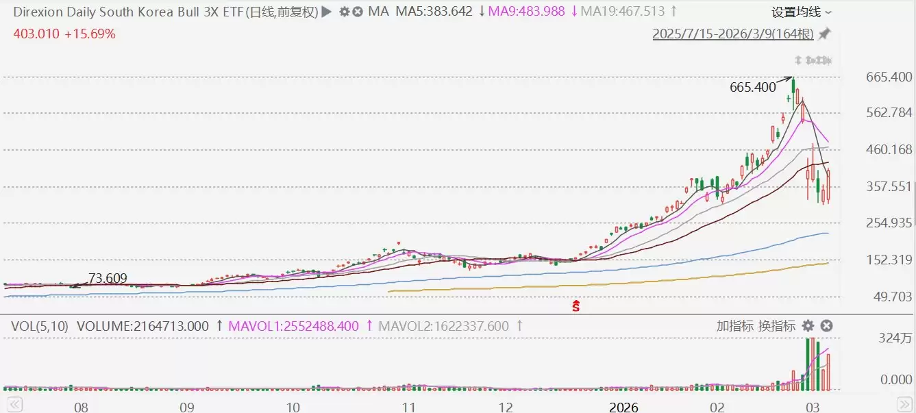 受美国总统特朗普关于“战争基本结束”的乐观言论提振,昨夜美股市场Direxion Daily South Korea Bull 3X Shares尾盘拉升,最终收涨15.69%,报403.01美元。