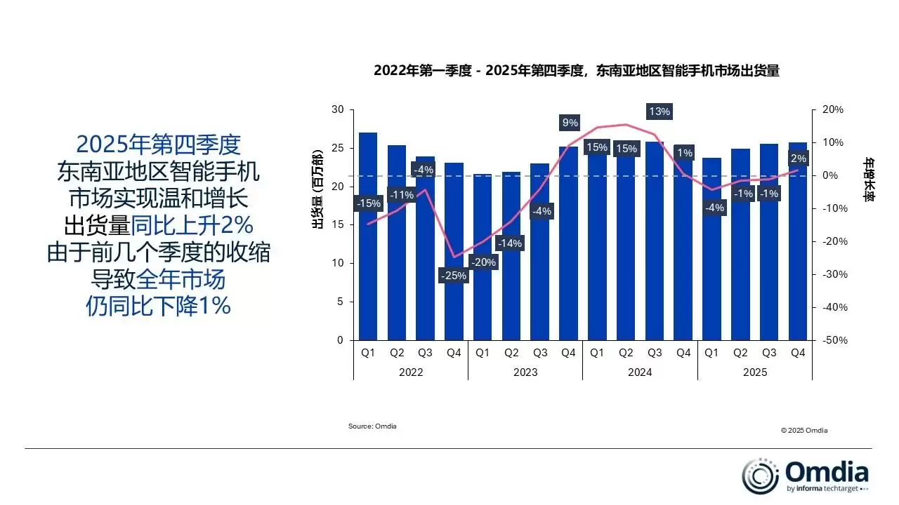 据Omdia最新研究报告显示,2025年东南亚智能手机市场表现先抑后扬,全年出货量达到1亿部,较上年微降1%。市场波动主要源于前三季度持续低迷,但第四季度以2%的同比增长实现反弹,出货量攀升至2580万部,终结了连续三个季度的下滑趋势,显示出年末消费需求回暖的积极信号。