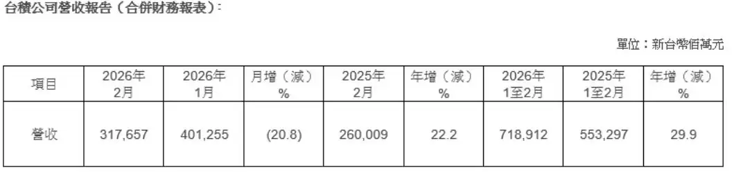 台积电于3月10日公布2026年2月营收数据。当月合并营收约为新台币3,176.6亿元,相较上月减少20.8%,但较去年同期增长22.2%,创下历年同期新高。累计今年1至2月营收总额约为新台币7,189.1亿元,较去年同期增长29.9%,同样为历史最佳表现。