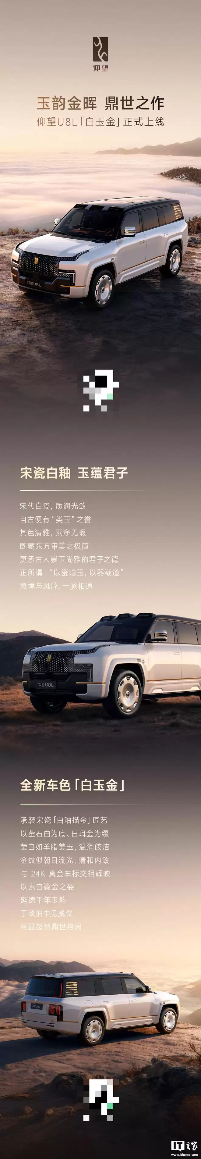 IT之家3月10日消息,比亚迪仰望汽车今日正式宣布,仰望U8L「白玉金」配色正式上线。据悉,这款配色汲取了宋代瓷器的「白釉描金」工艺精髓,以莹润的玉石白为底色,点缀以雅致的日烁金色调,同时还创新采用了24K真金车标设计。