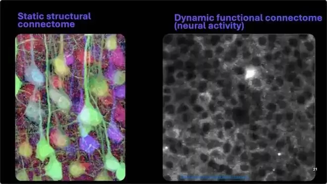 第一件是结构,也就是大脑里每一个细胞的位置,以及它们之间是如何连接的。这部分依赖高分辨率扫描技术,把神经元和突触一层层重建出来。