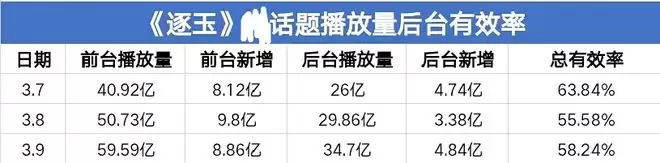 而某短视频平台后台有效率数据也露馅了,前台三日播放量陆续显示40亿、50亿、59亿,后台播放量分别是20亿、29亿、34亿,有效率最高63%,还是首播,最低是55,这与其他影视剧的数据完全不一样。有网友表示大多数影视剧的转化率基本都超过80%,吐槽《逐玉》转化率实在太低。