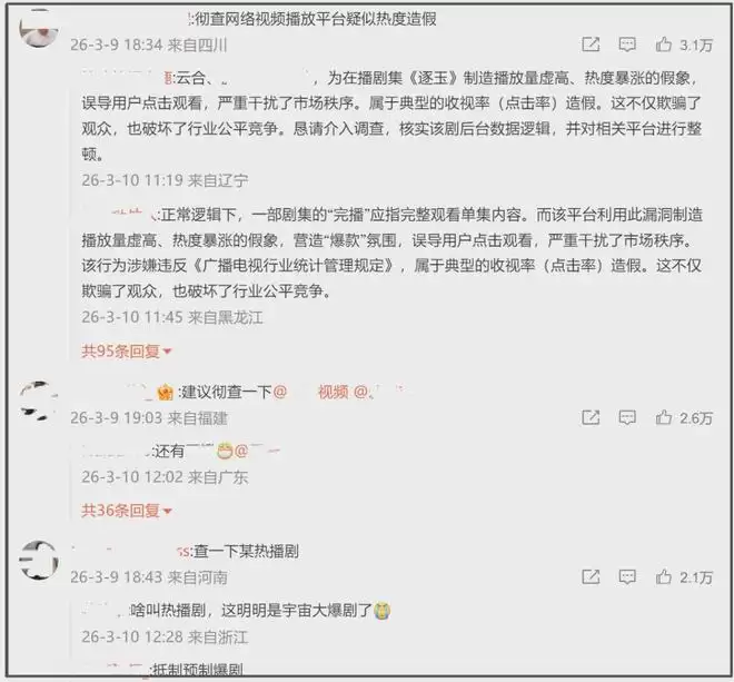 多位网友要求主管部门彻查两家网络视频播放平台疑似造假情况,指出《逐玉》存在播放量虚高、热度暴涨假象,平台利用漏洞混淆“完播”概念营造爆款,误导用户观看点击扰乱市场秩序,属于典型的收视率造假,涉嫌违反《广播电视行业统计管理规定》,希望针对此类现象进行整顿。