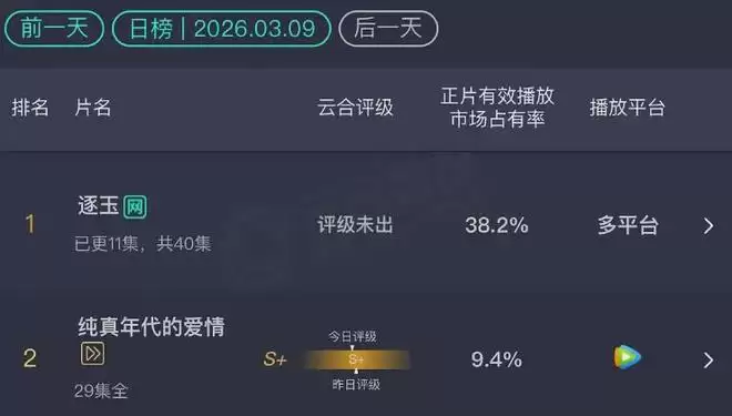那么,《逐玉》的数据离谱到什么程度呢?看云合的播放数据,市占率达到了38%,堪比史诗级大爆剧。