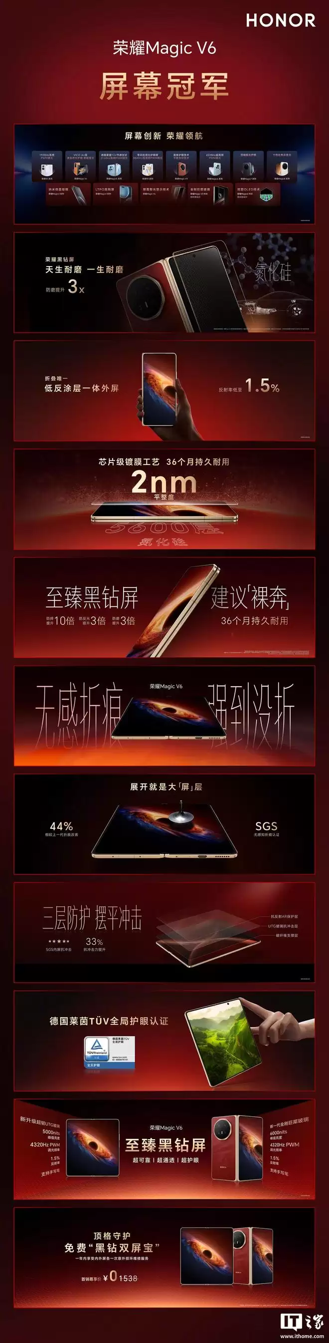 据介绍,荣耀 Magic V6 配备全新黑钻屏,主打超可靠、超通透、超护眼特性,每块屏幕镀有 5600 层氮化硅,防磨性能提升 3 倍;拥有折叠唯一低反涂层一体外屏,反射率低至 1.5%。