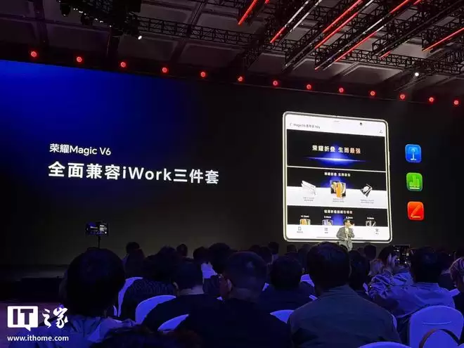 荣耀 Magic V6 还兼容苹果生态,可查看 iCloud 云图库、秒变 Mac 拓展屏、兼容 iWork 三件套、行业首发 Mac 一碰即传等功能,同时还支持 AirPods 原生级体验、Apple Watch 信息共享、iPhone 共享热点等功能。