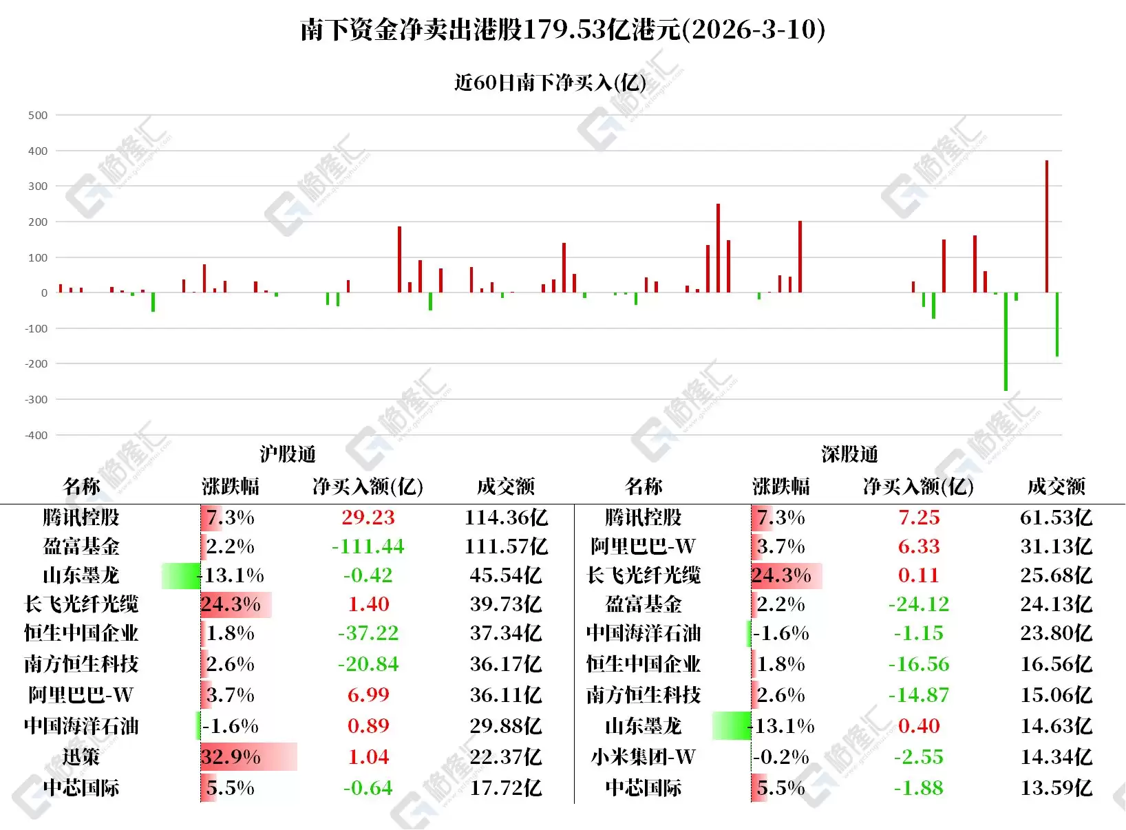 格隆汇3月10日讯|南下资金今日整体呈现净卖出态势,在港股市场共计流出179.53亿港元。具体来看: