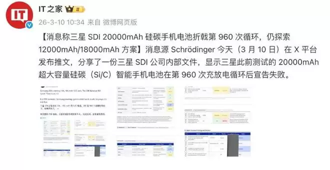 参考IT之家的消息来看,一份三星 SDI 公司内部文件显示,三星此前测试的 20000mAh 超大容量硅碳(Si/C)智能手机电池在第 960 次充放电循环后宣告失败。