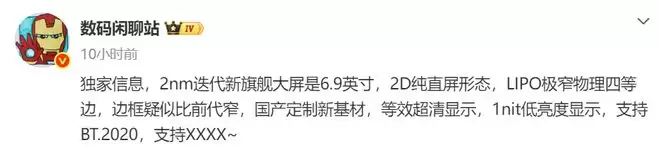 只是没有想到,近期有博主透露某迭代新旗舰将采用6.9英寸LIPO极窄物理四等边直屏,搭载国产定制新基材,支持BT.2020色域和1nit低亮度显示。