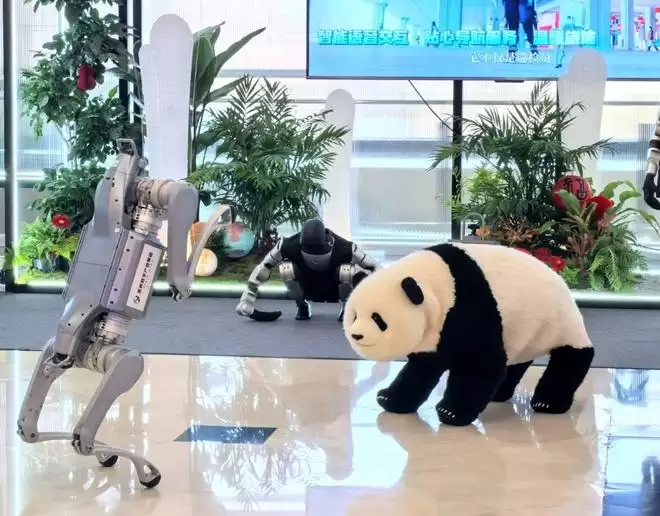 现场展示的机器狗和机器熊猫。