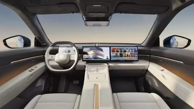 从设计上看,与众08采用了环抱式座舱布局,上层区域带来开阔的视野,下层则采用“个人岛屿”式的分区设计,营造出私密感。功能方面,新车配备了双14.96英寸2.4K超高清智能联屏以及10.25英寸高清液晶仪表,集成了导航、车况及ADAS交互信息。