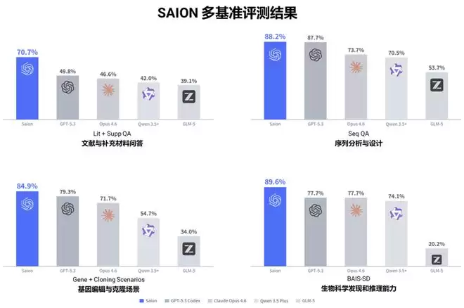 在文献理解、生物序列推理、基因工程设计与科学发现等关键科研任务中,SAION 均显著领先通用大模型和多项专业模型。