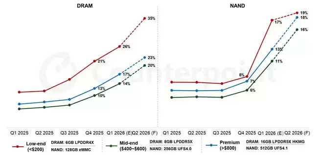 ▲智能手机存储成本占比预估,2025年第一季度到2026年第二季度,来源:Counterpoint