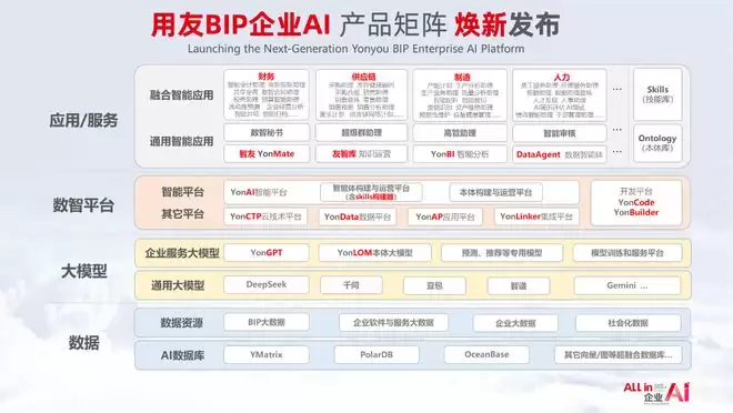 企业数智化的深度突破,离不开坚实的技术底座与全链路的能力支撑。用友BIP企业AI产品矩阵以全栈式架构设计,实现了从数据层、模型层、平台层到应用层的全链路贯通,打造可构建、可运营、可进化的企业AI全能力底座,为企业智能决策与自主执行筑牢技术根基。