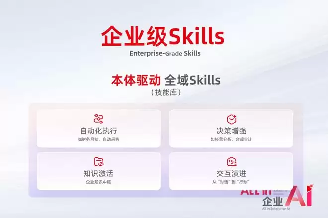 应用层则覆盖融合智能应用与通用智能应用/服务,结合Ontology与Skills,实现AI能力在企业全业务场景的深度落地与规模化应用。