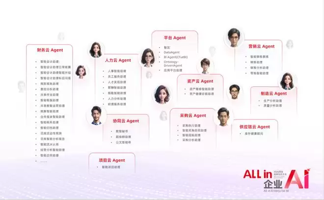 除了通用智能体之外,用友BIP还将AI与业务场景深度融合,在财务、人力、供应链、采购、制造、营销、研发、项目、资产、协同十大领域中融入60多个智能体。