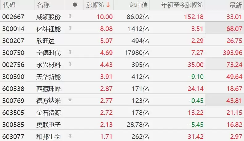 3月11日,A股市场锂矿板块普遍上扬,其中威领股份涨停,亿纬锂能涨幅达到8%,欣旺达涨5%,宁德时代、永兴材料涨幅均超过4%,天华新能涨近4%。