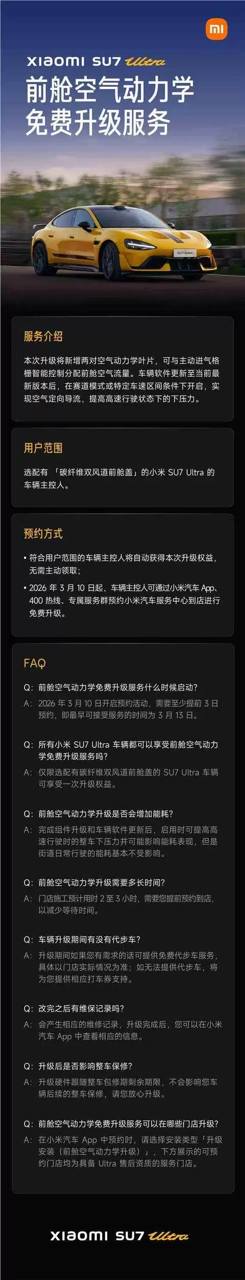 小米汽车近日公布,将为小米SU7 Ultra开孔机盖版车型的车主提供一项免费的前舱动力学升级服务。符合条件的老车主无需主动申请,系统将自动为其配置升级权益。这一举措体现了品牌对用户体验的持续关注与重视。