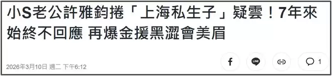 此前还有传闻,大S去世后,小S没人撑腰,许雅钧打算和小S离婚,让私生子认祖归宗,如果小S不答应就会净身出户,而小S始终未对此类传闻做出回应。