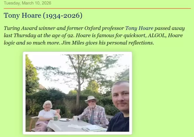 今天,计算机科学博客 Computational Complexity 披露了一则消息:图灵奖得主、快速排序算法发明人、null 引用的提出者托尼·霍尔(Tony Hoare)于 2026 年 3 月 5 日在英国剑桥安然离世,享年 92 岁。