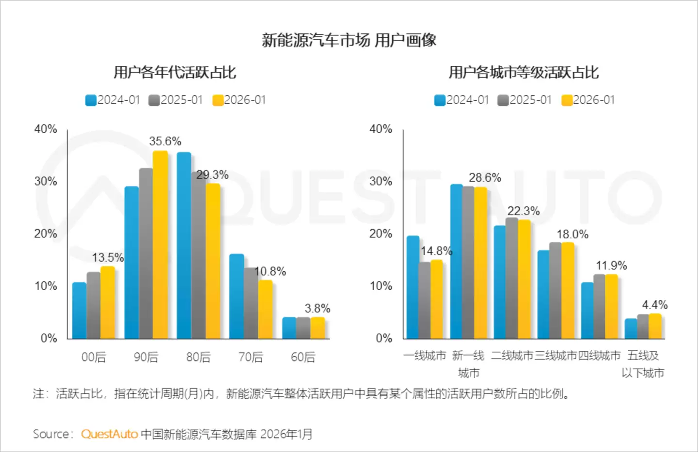 1、90后成为市场主力,活跃占比超越80后,持续攀升至35.6%,三线及以下城市合计占比34.3%,较2024年1月提升3.8个百分点