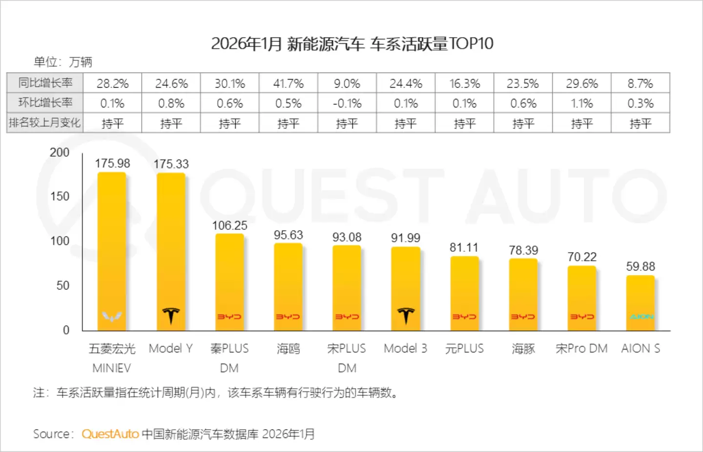 4、车系活跃量排名稳定不变,五菱宏光MINIEV和Model Y双双突破175万辆,第二梯队车系竞争日趋激烈