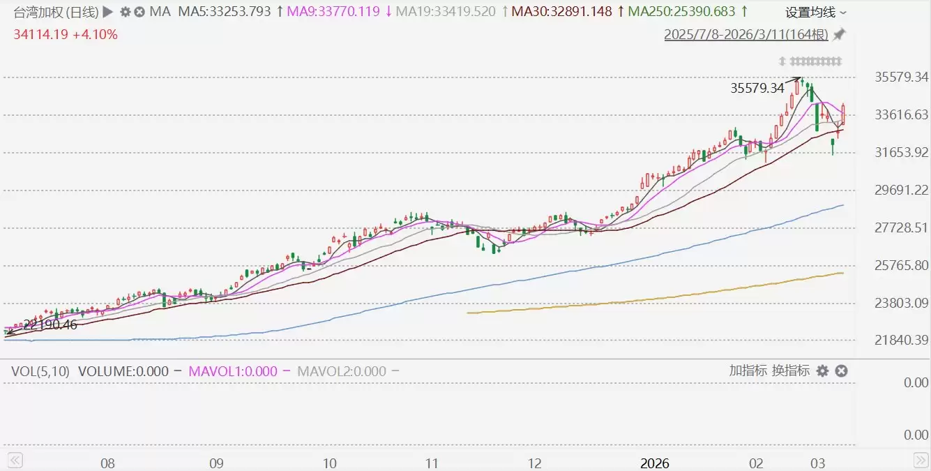 格隆汇3月11日|台湾加权指数收盘上扬1342.32点,涨幅4.1%,报34114.19点。